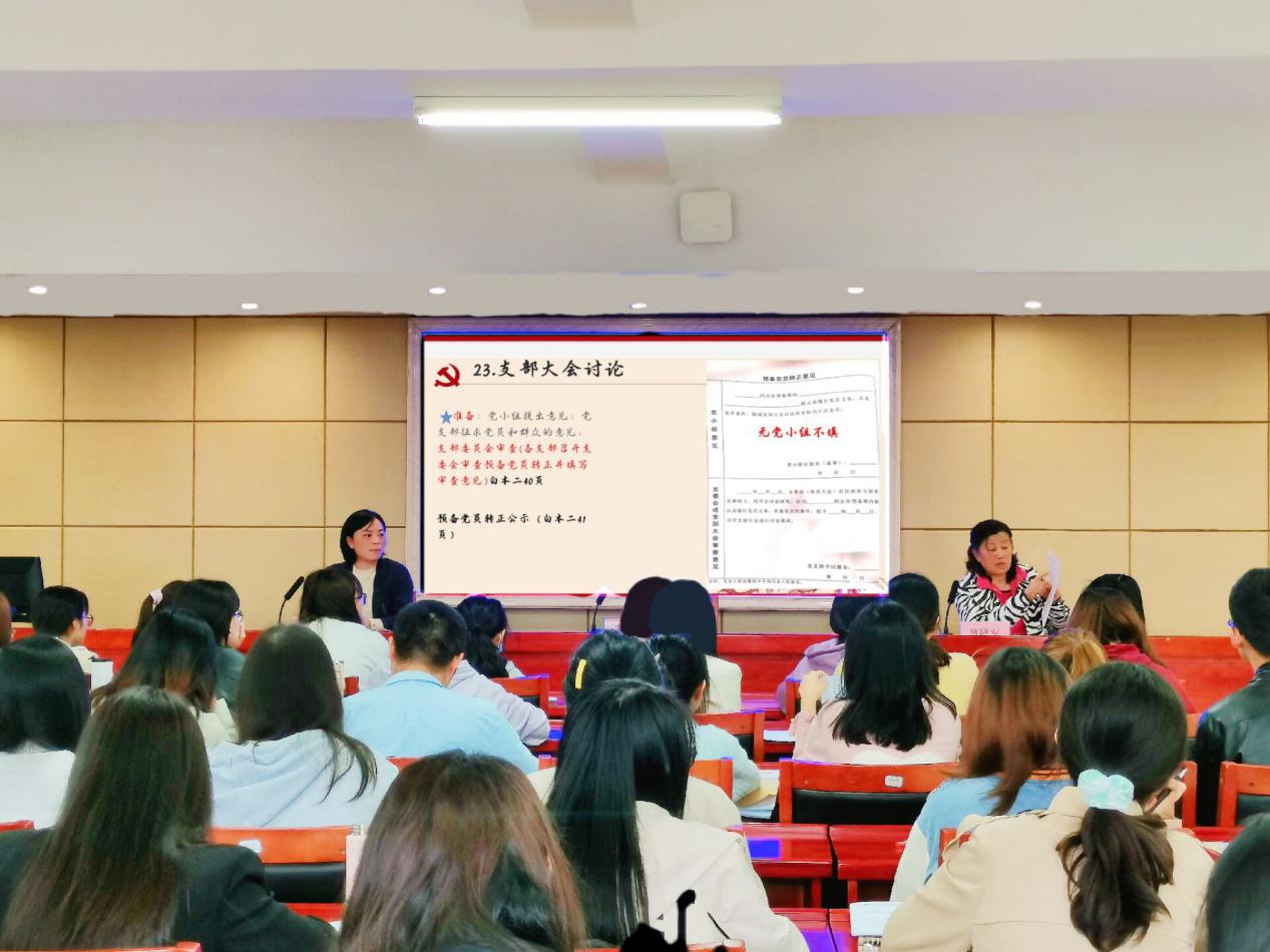 我院党建办发展部部长王雅琳同志在发言时指出,发展党员规范化工作手册涵盖了整个发展流程。并详细讲解了关于《确定发展对象意见》之党小组意见、培养联系人意见以及党员和群众意见、支部党员大会讨论记录、发展对象公示情况登记表、政审综合情况登记表等内容的填写要求。在最后,她表示,希望大家在日后的工作中能够相互配合、相互包容,共同完成相关的资料填写工作。