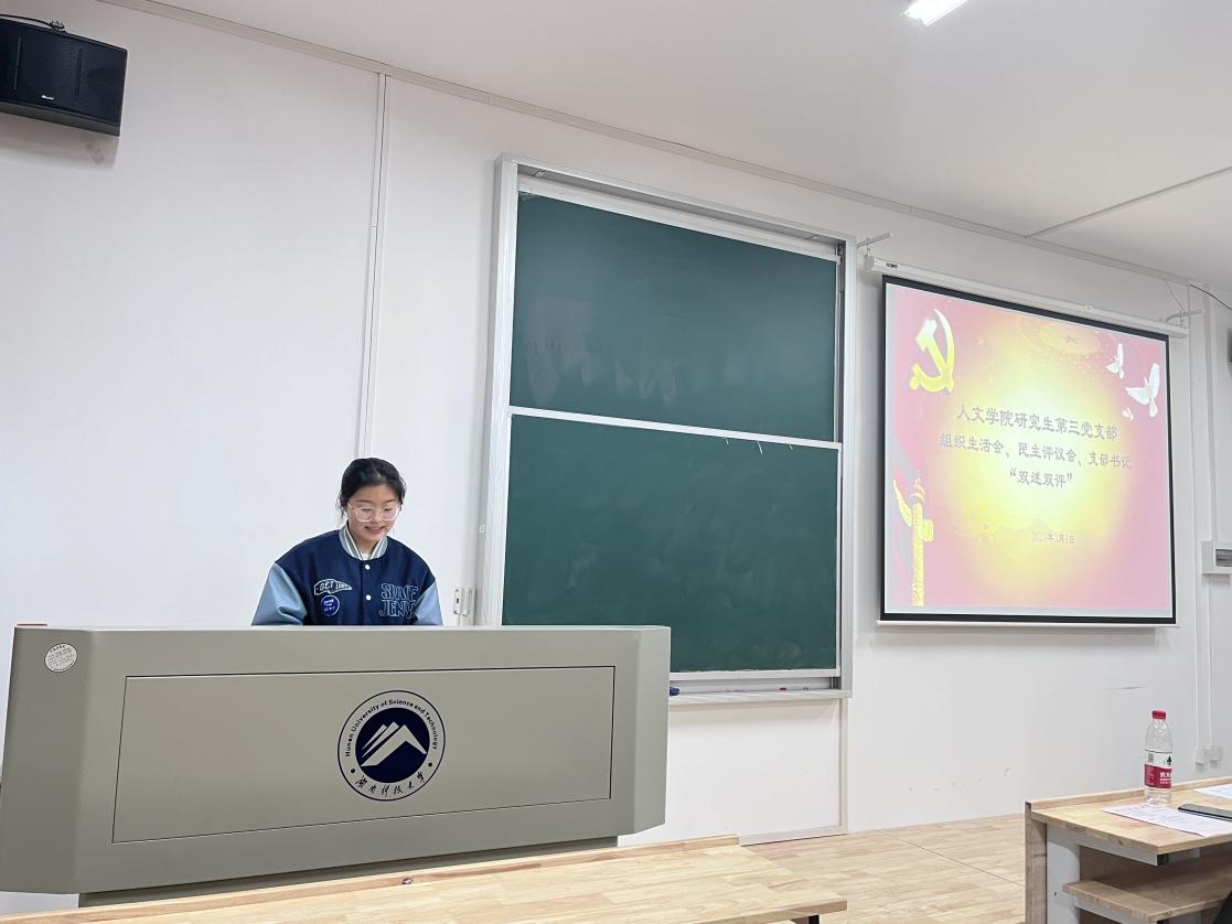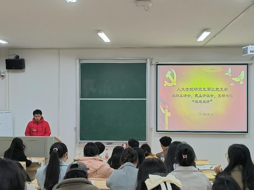 3月1日晚,华体会注册研究生第三党支部组织生活会、民主评议会、支部书记“双述双评”会在我校雨湖校区2教101教室召开。华体会注册党委委员、副院长袁星洁教授、第三党支部32位正式党员以及5位群众代表参加会议。