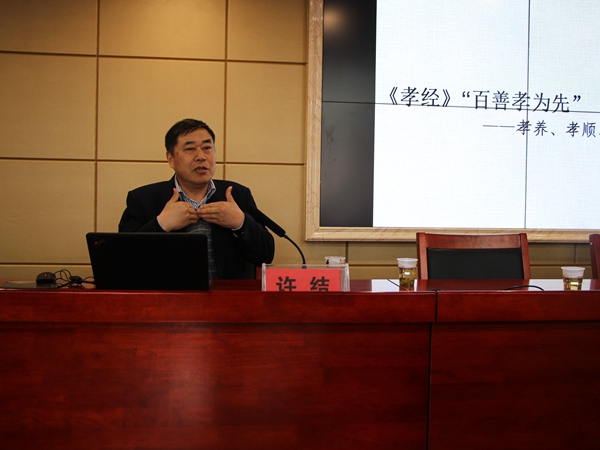 “我这次来不算做什么报告,只是陪大家聊聊天。”开场,许结教授谦虚地说道。何为经典?许结教授认为应从三大系统了解经典:知识系统、心态系统与思想系统。“尽信书则不如无书。”他认为在阅读我国传统文化经典时应当带着我们的生命去读古人的生命。老年或中年,得意或失意,晴或阴,不同情境下读经典会产生不同的人文情境。由此,许结教授为师生们阐述了阅读经典应当注意营造如下四大人文情境:一是道德情境。“道”是通往“德”的途径,“德”即人性,道德情境是阅读经典必须具备的情境。他引用《孝经》中的名句“百善孝为先”,说明孝是最基本的道德,并详细介绍了“孝养”“孝顺”“孝敬”三个层次的涵义。他希望同学们践行孝义,使之内化为道德的情怀。二是学术情境。许结说,学术情境即“求真”,绝对真理易识,相对真理难求,人生就是不断实践和印证相对真理,而从阅读经典中获知相对真理是一件快乐的事。他以朱熹的名言“问渠那得清如许,为有源头活水来”和孔子论智的名言鼓励同学们积极进取,求知求真,从“博与精”“渐与顿”“得与失”三个方面理解和营造学术情境。三是艺术情境。他以宗白华的“化实景而为虚境,创形象以为象征”诠释艺术的涵义。他认为中国艺术的最高境界是“妙不可言”,并列举了古代诗词中以“杨柳”象征“别情”来营造凄婉精美的情境,以及古代参加科举考试的考生以美人化妆象征“登第”的例子。他说,要学会品味古人的风雅和趣味,把经典读“活”,让经典生动起来。四是自然情境。即热爱自然、顺其自然、达到天人合一的境界。他通过介绍西方的进化论和新基督教的霸权教义、“庄周梦蝶”和“濠梁之辩”,呼吁大家亲近自然、珍惜自然。他说,人生需要理性批判,也需要趣味批判,趣味的批判源于自然,大家要保持“清风明月”的情怀,不要对自然视而不见。许结教授总结说,经典阅读四大人文情境中,道德情境在于敬,学术情境在于诚,艺术情境在于趣,自然情境在于和。
