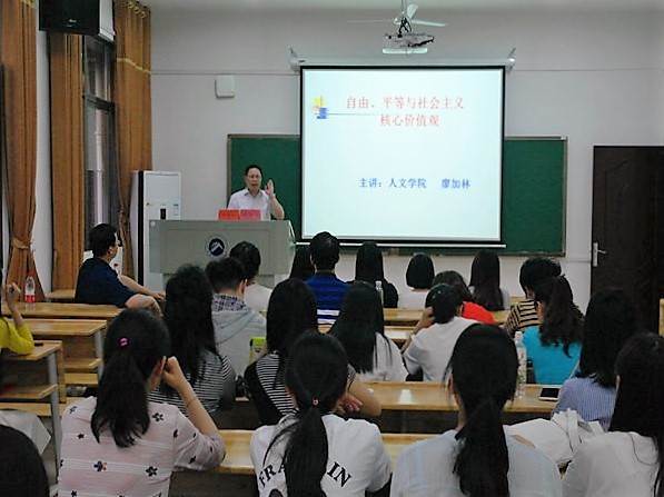 本次专家讲座分为两场,分别邀请华体会注册党委书记廖加林教授和我校社科处副处长、华体会注册李胜清教授作主题讲座。廖加林教授的讲座主题是《自由、平等与社会主义核心价值观》,廖教授在讲座中从“核心价值观”的定义谈起,从哲学社会科学的角度全面分析了社会主义核心价值观。他借用苏格拉底的名言“未经省察的人生是没有价值的”,鼓励、引导同学们要重视个人的三观,努力发掘自己在个人、社会、国家等三个层次的价值。