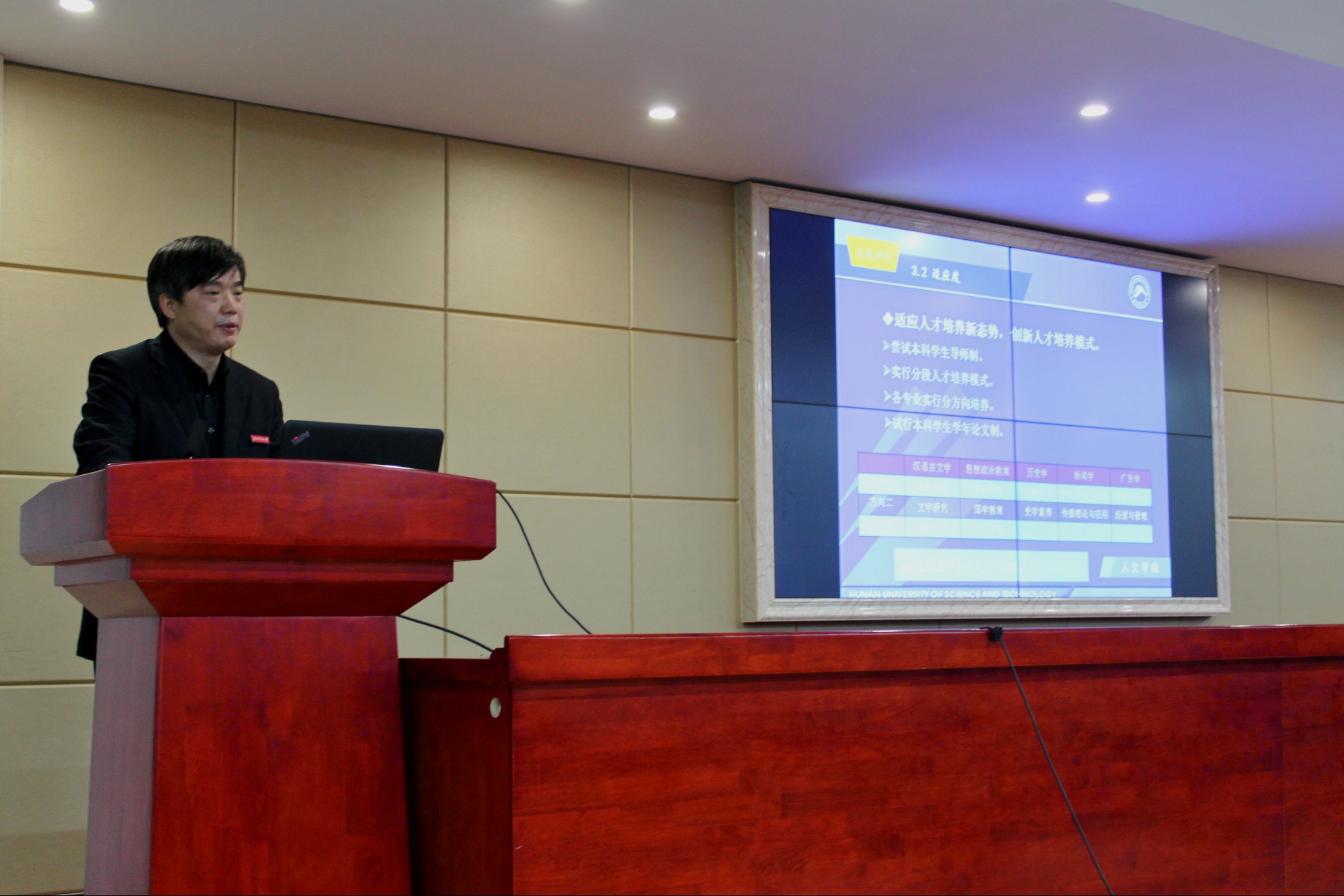 上午9时许,现场考察转移到立言楼B4-1报告厅,院长刘奇玉教授主持会议并做简要的汇报,院领导、相关系部负责人和教师代表近20人出席会议。刘院长首先简要阐述了华体会注册的办学历程以及办学现状,学院的师资队伍以及定位与目标,他指出我院的办学类型是教学研究型,办学层次是本科教育为主,发展目标是特色鲜明的高水平教学研究型学院。3211工程、豆沙包工作室、黑蚂蚁传媒工作室、语言艺术团、隐山哲学社等学院优秀项目是学院坚持“守正创新”办学宗旨的重要体现。