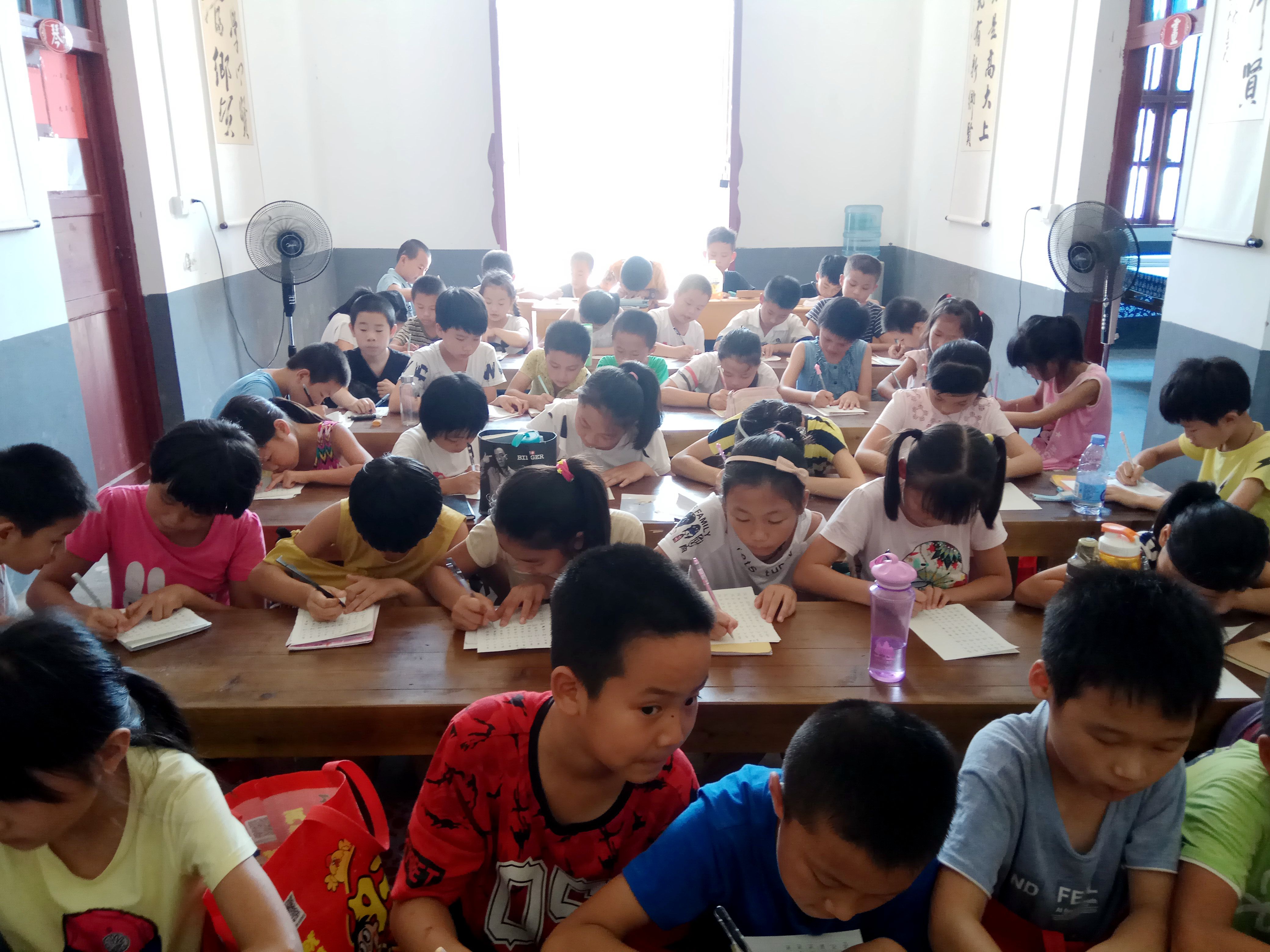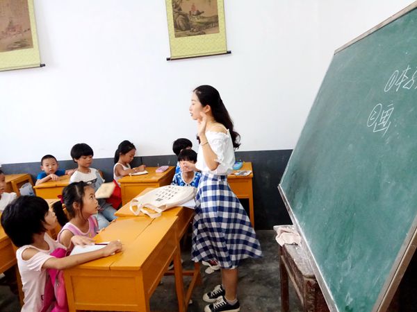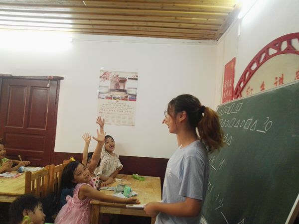 六六三十六、六七四十二、六八四十八……清脆的童声和着拍桌子“咚咚咚”的节奏声传出教室外。22日上午,小学一年级教室里,小朋友们坐的堂堂正正,在志愿者唐亚妮的带领下高声诵读九九乘法表。这种依据节奏记忆顺口溜的方法是我院志愿者在备课期间琢磨出来的,“小朋友们记忆力好,但可能难以集中注意力,通过这种方法既可以吸引孩子们的注意力,又能让他们在乐趣中学到知识。”授之以鱼不如授之以渔,唐亚妮在黑板上画出连续几排图形,并空下几个,让小朋友们找规律填几何图形,在几分钟安静的思考后,教室又重新“热闹”起来,小朋友争先上黑板展示自己的答案,唯恐老师不点自己去写,还站起来把手举的高高的招呼自己的小老师:“老师,老师,我知道,我要上去写。”孩子们在教室听的认真,教室外家长连连点头赞许,烈日灼灼,挡不住的是志愿者们的热情与担当。临近下课,唐亚妮敲敲黑板,给大家留了一道家庭作业:987654321=100,其中填入3个“+”和1个“--”使等式成立。这个趣味题立刻又引起了孩子们的积极动脑,围在桌子旁热烈的讨论了起来。
