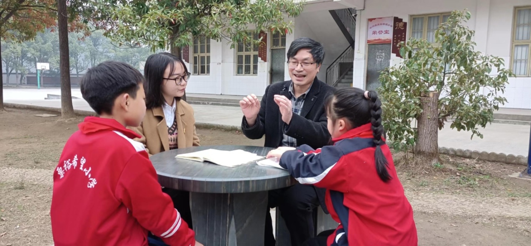 李柏霖和导师吴投文教授在粟裕希望小学指导孩子们写诗。