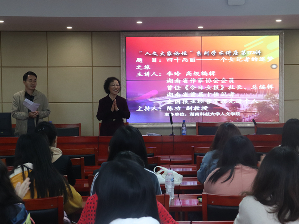 成为一名成功的新闻人应该具备怎样的精神?10月16日下午,《今日女报》社前社长、高级编辑李玲做客我院人文大家讲坛,在立言楼B4-1会议室做了一场题为“四十而丽——一个女记者的逐梦之旅”的讲座。李玲结合自己经历解答了成为成功新闻人的精神素质——“四要”。