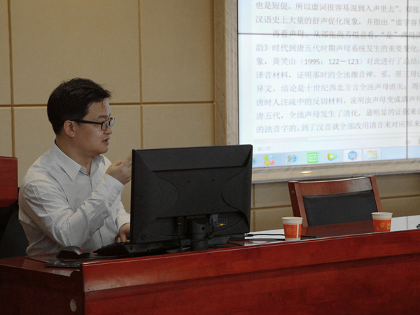 讲座在热烈的掌声中正式开始。朱冠明教授从语言功能和语义结构两个部分展开,并从到哪里去了、从哪里来的、的字源和语源几个方面详细地介绍了近指代词的来源,且分析了的历史源流关系。朱教授认为,近指代词字源于字,字从先秦到魏晋南北朝都是常见的指代词,从唐代开始,人们就放弃了对的偏好,而这个指代词也从此登上历史舞台。而关于是哪来的,朱教授指出,早期是在北方使用的,较早的用例出现在中唐时期。